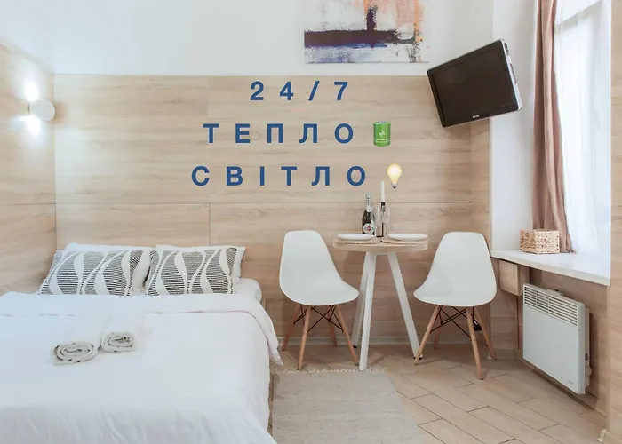 Los huéspedes pueden preparar sus propias comidas en una pequeña cocina equipada con un hervidor eléctrico. Para no cocinar, los restaurantes Art Maestro y la Pizza Letta Restaurant están a 5 minutos a pie. La parada de autobús Lystopadovoho Chynu está a un paso del apartamento Neveliki Apartamenti - Smart V Centralnius Chastini Bila Tz Magnus.